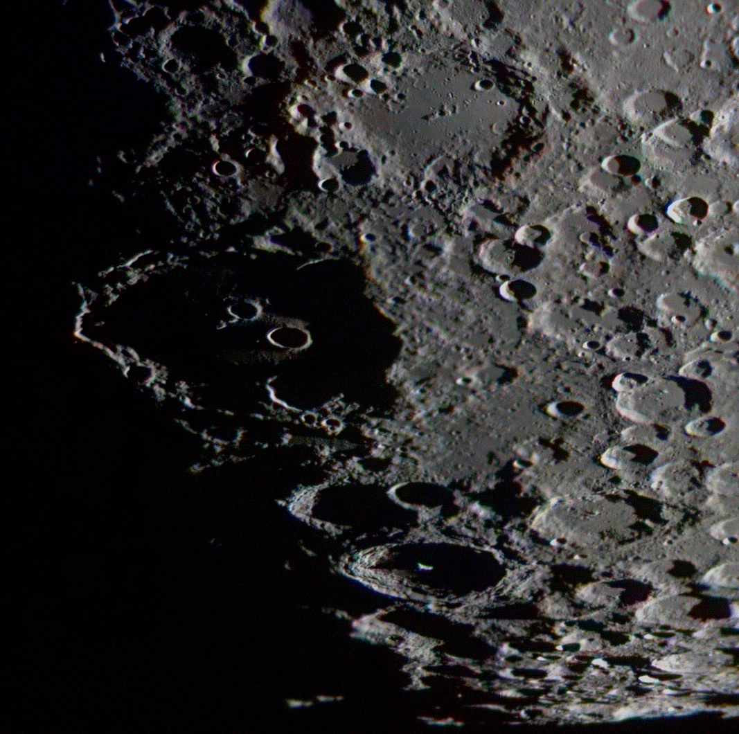 クラビウスが夜明けを迎える頃、クラビウス内部の小クレーター、クラビウスCとDに光が当たり、周囲がまだ暗い中でリング状に輝きます。これはThe Eyes of Clavius(クラビウスの目)と呼ばれる現象です。