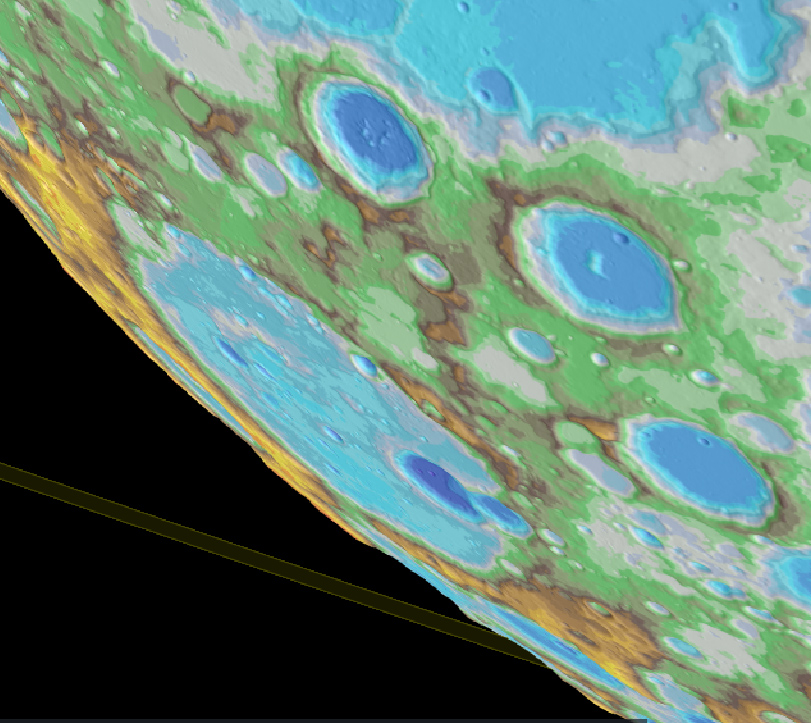 バイイに適用してみると、お堀のように窪んで見える部分と盛り上がっている部分の様子がよくわかります。やはり盛り上がっている部分は弧を描く山脈のようで、周辺より少し標高が高くなっています。