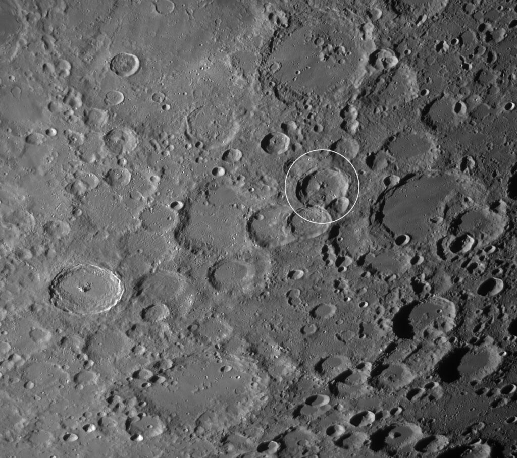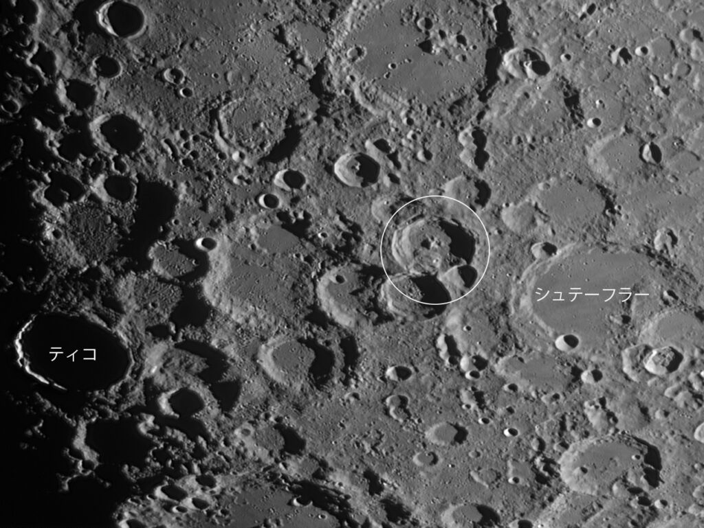 月面ガイドブックに「「正のつみ重なり」を最もよくあらわしている月面の一部」と紹介されている場所あたりで、ティコの東側になります。