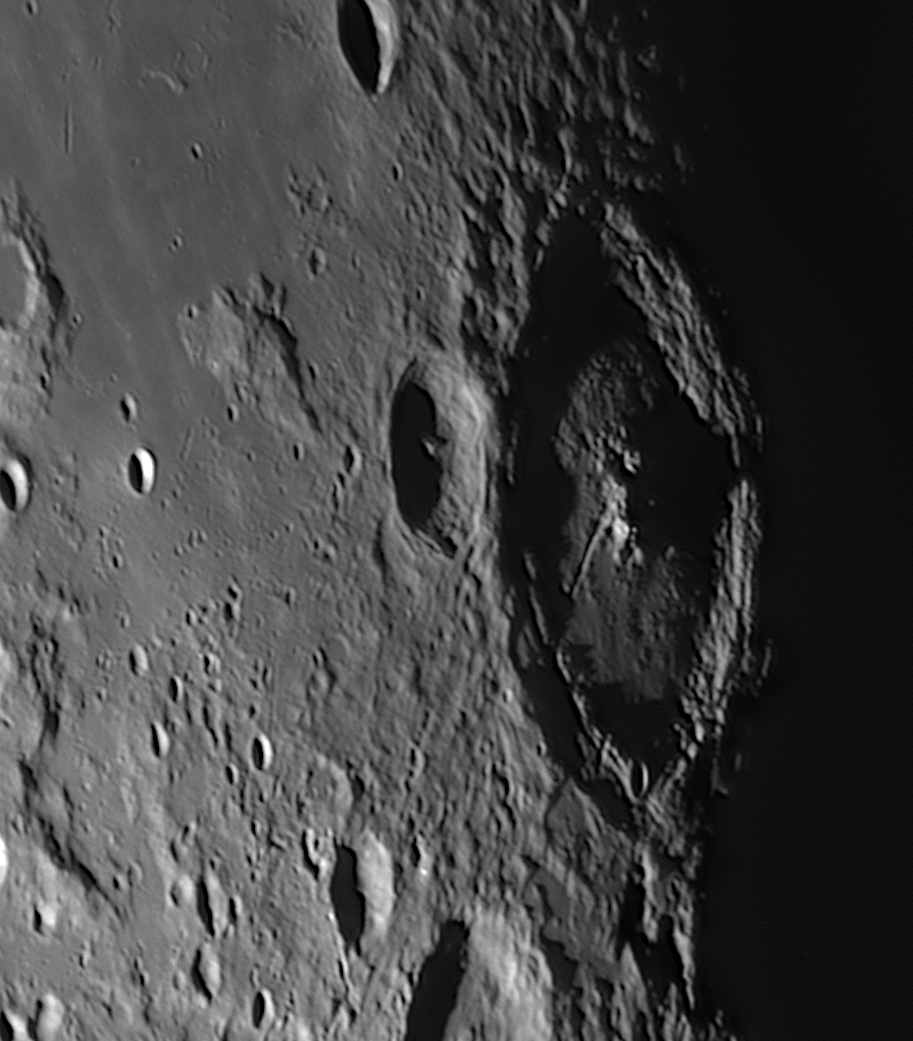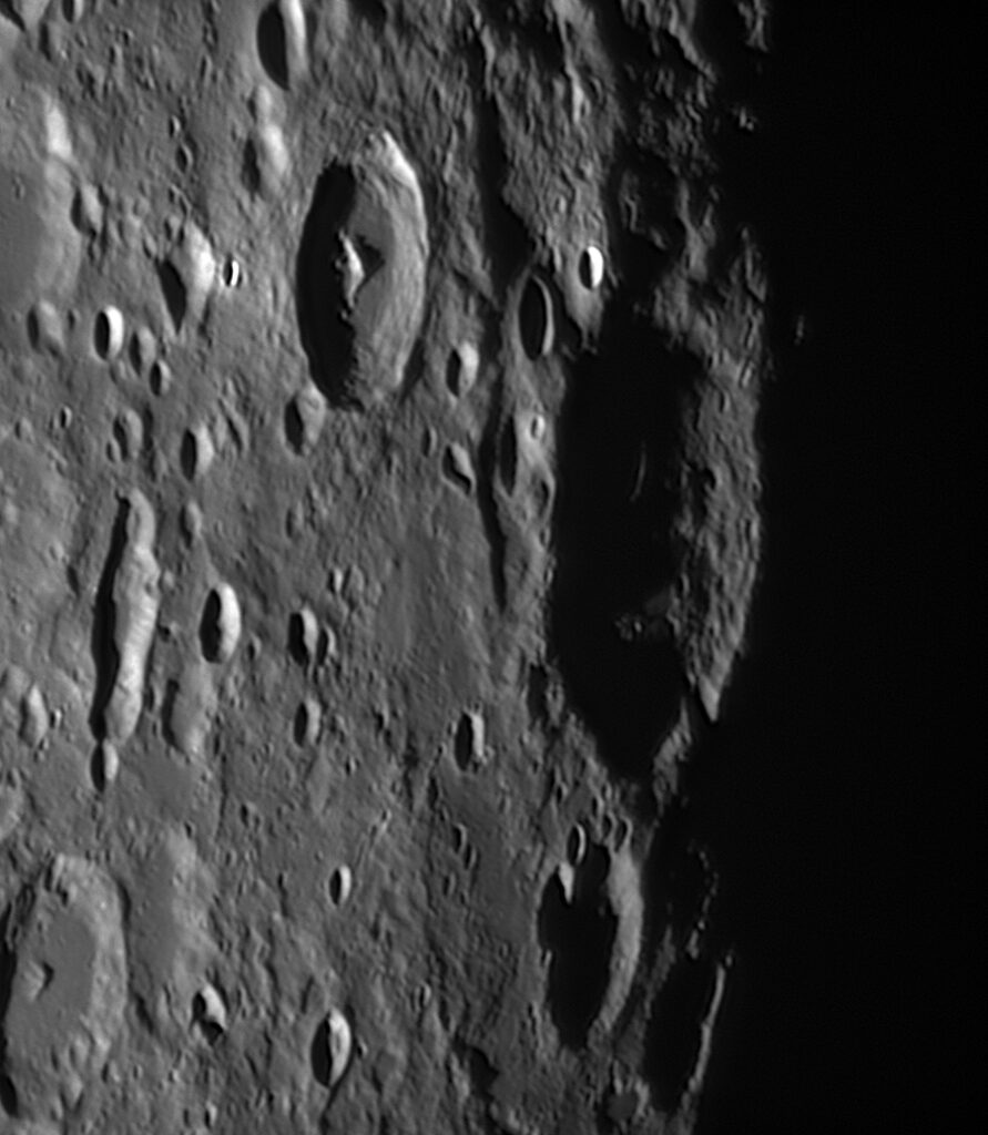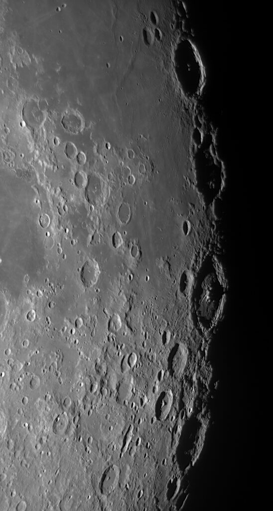 この日はラングレヌス、フェンデリヌス、ペタビウス、フルネリウスの4大クレーター列がちょうど暮れていくタイミングでした。