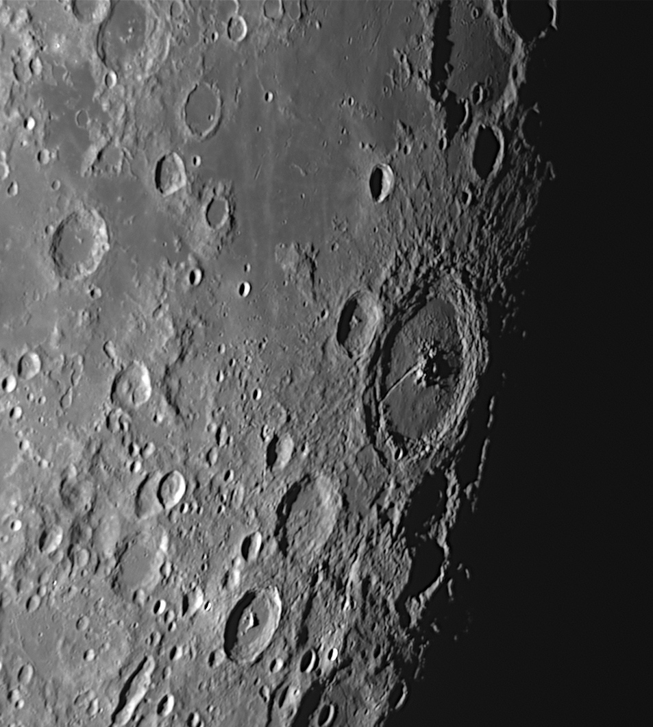この日は南側の秤動が良かったので南極付近を撮影したのですが、ちょうど東側クレーター列が欠けぎわで、ラングレヌスのネコ耳(ネコの耳よりもう少し伸びていたでしょうか?)が見えていました。