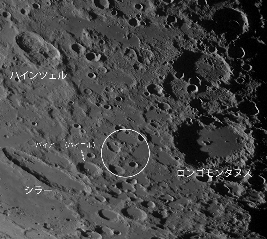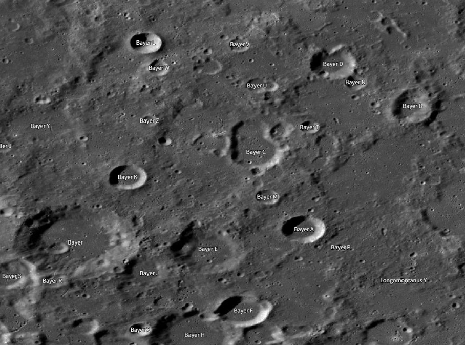シラーの北東に接する直径47kmのバイアー(バイエル)がありますが、このバイエルの名前が付いた小クレーターが点在する地域です。