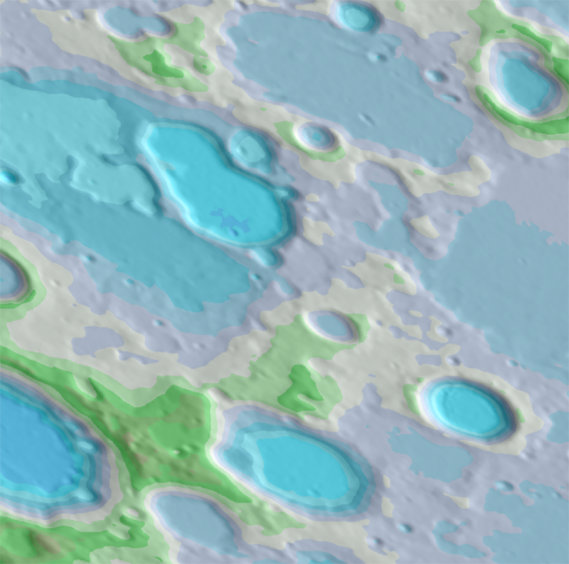 LROC QuickMapの標高データ地図でも、同じような場所が高くなっているようです。水色→白→緑の順に高度が上がります。