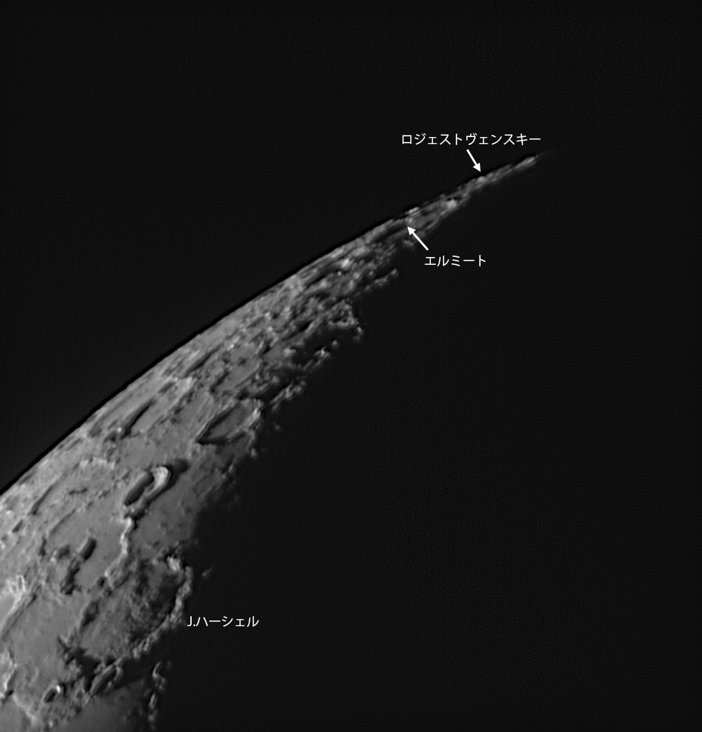 また秤動が非常に良い時、ピアリやエルミートのさらに向こう側に、大きなクレーターの周壁のような光の帯が見えることがあります。これは月の裏側にあるロジェストヴェンスキーで直径が178kmあり、ペタビウス(177km)とほぼ同じサイズの大クレーターです。