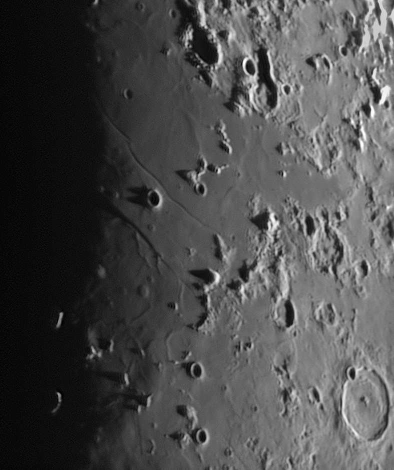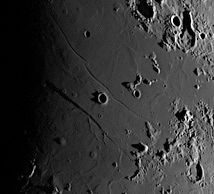 コーシーから延びる影が2本に分かれているのがよくわかります。またコーシーω、コーシーτ(タウ)の二つのドームも目立ちます。
