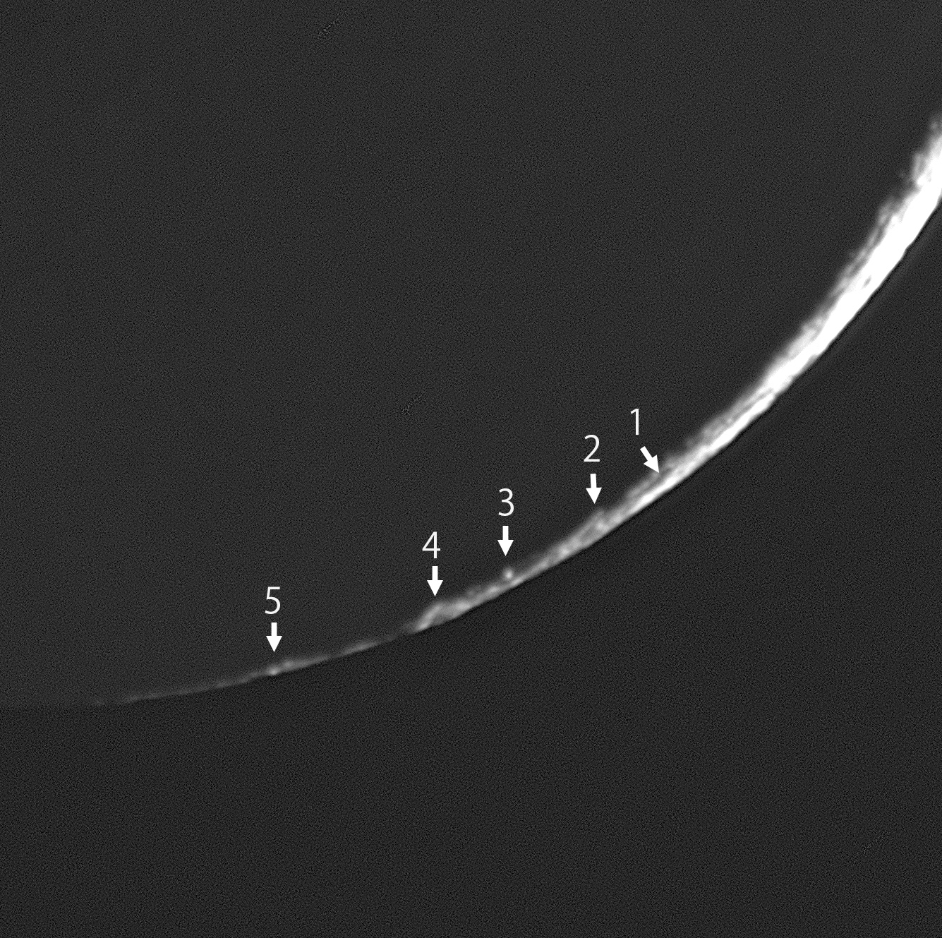 1がギル・クレーター、2がヘルムホルツの東側、3の光点がノイマイヤーの西縁、4がデモナクスの東縁、5がアムンゼンの東側あたりでしょうか?