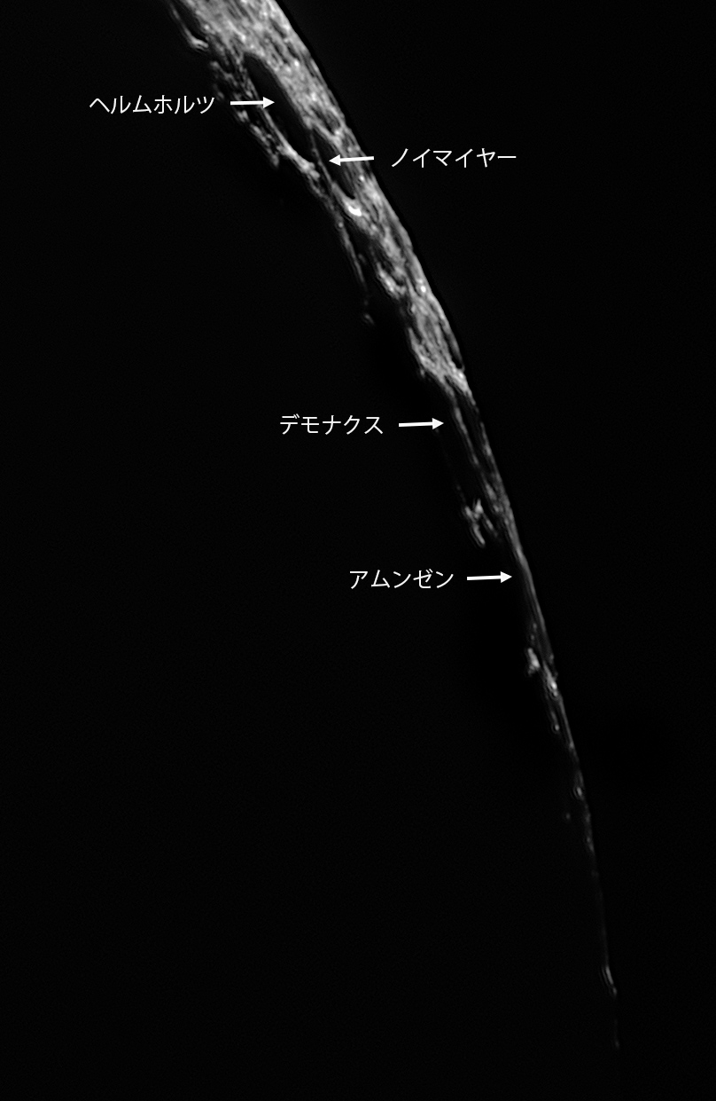 東側四大クレーター列が欠けぎわに見えていました。秤動は良くないのですが、ラングレヌスの中央丘の影が2つに分かれている様子が写っています。普段満月過ぎに見る場合とは影が逆方向に延びています。