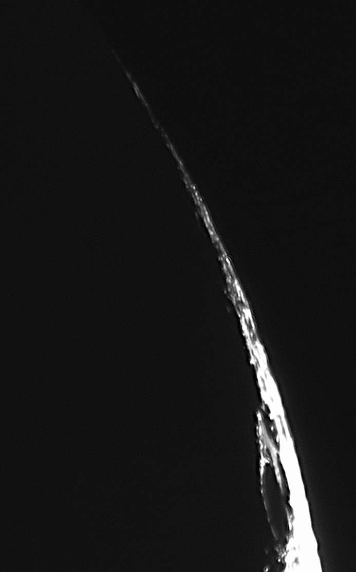 3/21もかなり水平に近い月とのことでしたが、3/20に比べると肉眼や双眼鏡で見ても明らかに右上がり(通常の上弦側の月)に見えていたように思います。3/20よりも高度が高かったことも影響しているのかもしれません。また月の南側(画像の左側)の先端付近は暗くなっているので、その影響もあるのでしょうか。